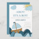 Baby shower bleu marine moderne et unique avec une illustration d'un voilier dans la mer ondulée. Illustré et dessiné par Patricia Alvarez.