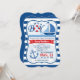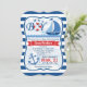C'est un garçon ! Nautique, Sailboat thème garçon baby shower invitation sur marine bleu et blanc rayures motif. Il est équipé d'un voilier bleu foncé et clair naviguant sur l'eau ondulée de l'océan, d'un sauveteur rouge et blanc et d'un ancre de bateau bleu. Les couleurs comprennent le rouge écarlate, le bleu royal, le blanc et le bleu ciel. invitation vintage en forme de support.