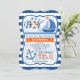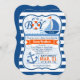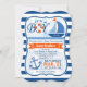 C'est un garçon ! Nautique, Sailboat thème garçon baby shower invitation sur marine bleu et blanc rayures motif. Le voilier bleu foncé et clair navigue sur l'eau ondulée de l'océan, sauveteur orange et blanc et ancre de bateau bleu. Les couleurs sont orange, bleu royal, blanc et bleu ciel. invitation vintage en forme de support.