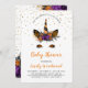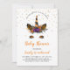 Cette douce invitation à baby shower sur le thème de l'Halloween présente un mignon visage de licorne avec corne et paupières en faux parties scintillant orange et noir, orné d'un bouquet d'automne de fleurs orange, noires et violettes et de feuilles sur les mots "Baby shower" dans un script de brosse à l'écriture orange. Des confettis en or faux flottent d'en haut. Customisez avec le nom de la maman-to-be en écriture orange, avec les détails noir sans serif police. L'envers est assorti de bouquets et de confettis. Idéal pour un baby shower d'octobre.