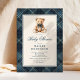 Célébrez une future maman avec ces invitations pour baby shower en forme d'ours en peluche à carreaux vintage. Avec un fond tartan bleu élégant et des coutures élégantes en faux or, ce design allie la tradition classique à un charme doux et moderne.
