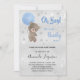 Pour un baby shower célébrant un bébé garçon. Un arrière - plan faux argenté. Un ours en peluche tenant un ballon bleu étoiles. Personnalisez et ajoutez le nom de la mère à être et les détails de la fête. Le nom et le texte : Oh Boy! et Bearly sont écrits avec un script de style manuscrit