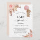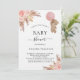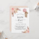 Pour un baby shower de style boho moderne. Arrière - plan blanc à l'avant. Décoré de fleurs roses d'or et de rose, de roses, d'herbe de pampas et d'une nana en peluche tenant un ballon rose. Personnalisez et ajoutez un nom et des détails du parti. Retour : Un arrière - plan rose en or.