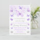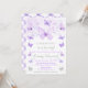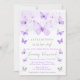 Cette invitation de baby shower aquarelle mignonne et fantaisiste présente des papillons violets et argentés et des confettis argentés. Le texte combine des polices manuscrites et sans empattement pour un look stylé et moderne. C'est parfait pour une baby shower.