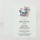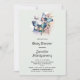 Une invitation à une baby shower avec un trio de papillons voltigeant parmi de jolies fleurs. Palette de couleurs bleu rose et vert.