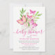 Ces baby showers par courrier d'invitations ont un design d'enveloppe d'aquarelle tendance avec papillons, fleurs, feuillage et police de caractères modernes. Personnalisez-les avec votre propre texte.
