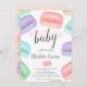 Bienvenue bébé ! Un baby shower à thème français avec typographie calligraphie moderne et élégante, avec dessert de macarons pastel peint à la main avec l'or et parties scintillant or rose en rose, lavande, vert, turquoise et jaune. Tous les éléments sont mobiles à vos positions désirées. Un mignon macaron empile à l'arrière!.
