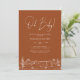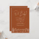 Invitation de baby shower moderne et minimaliste avec fond terracotta et écriture blanche, avec un dessin de paysage désertique à motif de cactus en ligne.