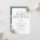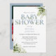 Une élégante invitation au baby shower avec une élégante typographie bleue poussiéreuse et un joli feuillage botanique et votre photo spéciale au verso. Conçu par Thisisnotme©