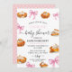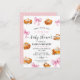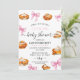 Cette invitation à la chéri saisit le parfait mélange de chaleur automnale et de douceur féminine. De magnifiques aquarelles représentant des tartes citrouilles côtoient des rubans et des arcs de couleur satinée, le tout posé sur une palette de couleurs douces de roses, de crèmes et de neutrales chauds. Le design est idéal pour accueillir une petite fille, évoquant un sentiment de maison, de récolte et de célébration chaleureuse.
