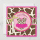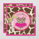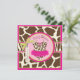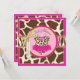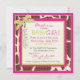 Sauvetage à l'empreinte guépard et amusant sur une étagère en tissu sur un arrière - plan poster de animal et un archet et ruban à l'air 3D pour une carte d'invitation pour baby shower fille. Les couleurs sont roses, vertes et marron.