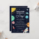 Baby shower de thème spatial mignon par mail invitation carte de modèle avec illustration d'une galaxie en crayon incluant un astronaute, U.F.O., planètes, étoiles, fusée. Le texte typographique dit "Houston nous avons un garçon !" Parfait pour un événement de distanciation sociale pendant la pandémie.