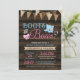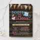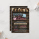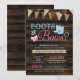 Cartes d'invitation pour une fête de révélation du sexe avec des bottes et des nœuds rustiques. Une invitation unique de révélation du sexe sur le thème country, avec une bannière en toile de jute, un nœud rose et une paire de bottes de cowboy bleues sur un fond en bois de grange.