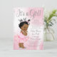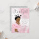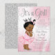 Invitation à un baby shower princesse africaine par courrier avec une adorable princesse bébé fille portant un tutu rose froufroutant et une couronne argentée avec un collier de perles sur un fond rose et argent magnifique. Cette invitation de baby shower par courrier est facilement personnalisable pour votre événement en ajoutant vos détails dans le style de police et la couleur et la formulation de votre choix.