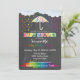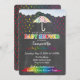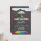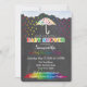 Cette belle Rainbow Raindrops Baby shower Invitation est dotée d'un parapluie de pois arc-en-ciel blanc sous des nuages doux, au milieu de gouttes de pluie de couleur arc-en-ciel qui tombent et qui se jettent dans une flaque de couleur arc-en-ciel. Tout cela est sur un arrière - plan noir en tableau noir. Le fond de l'invitation est un arrière - plan noir de style craie est une douche de gouttes de pluie arc-en-ciel qui tombe.