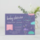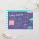 Charmant invitation baby shower dans de belles teintes de rose, violet et turquoise avec des nuages dessinés à la main, des gouttes de pluie et des étoiles. Le Baby shower est écrit dans un joli script de brosse. Ajoutez vos détails dans une police fine moderne. Le dos est recouvert de rayures prédatrices blanches et turquoise.