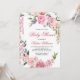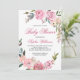Invitation de baby shower personnalisable avec des illustrations d'aquarelle dessinées à la main de roses roses roses, souffle de bébé, feuilles et feuillage. Parfait pour C'est une fille baby showers et baby showers de printemps.