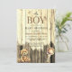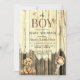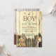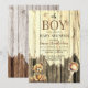 Une jolie invitation à baby shower rustique avec sépia à deux tons et bois brun de grange avec ours en peluche et hochet. Pour une ambiance moderne et rustique, avec l'expression "oh garçon" !