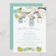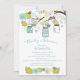 Invitation de baby shower de bocal de mason moderne et tendance avec une branche d'arbre avec de jolies fleurs florales bleues, vert chartreuse et marron et des bocaux de mason populaires rustiques suspendus. Un bocal a "c'est un garçon" imprimé dessus. Visitez notre boutique pour voir notre belle sélection d'invitations en bocal de mason pour un baby shower pour filles, baby shower pour garçons ou baby shower neutre pour le genre.