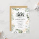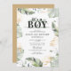 Invitation au baby shower animal safari de garçons sauvage, calme et élégant, avec girafe, effet or et feuilles verts. Parfait pour les invitations de baby shower garçon que vos invités aimeraient recevoir. Doté de feuilles de palmiers géants et de feuillage à effet or, ce design moderne avec un style élégant est facile à customiser pour créer une invitation unique de baby shower garçon pour vos besties de se joindre à vous pour célébrer la maman à être.