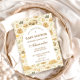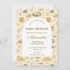 Un doux design de safari de style livre de contes mettant en vedette de doux animaux de bébé aquarelle, notamment des lions, des girafes et des éléphants, entourés de verdure de jungle douce et d'un fond botanique délicat. La palette neutre et chaude de crème, d'or miel et d'olive douce crée une esthétique intemporelle inspirée de la nature, tandis que la disposition arquée élégante offre un bel espace pour les détails de l'événement.