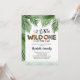 Invitations de douches pour bébé Wild one avec un simple arrière - plan blanc, parties scintillant verte, feuilles de palmiers tropicaux, le dicton "un peu sauvage est en route" dans différents posters de animaux, et un modèle de fête facile à personnaliser.