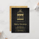 Éblouissez vos invités avec cette élégante invitation au baby shower avec une belle volière dorée contre un arrière - plan noir damassé. Ajoutez simplement les détails de votre événement sur ce modèle facile à utiliser pour en faire une invitation unique. Retournez la carte pour révéler une fausse texture de parties scintillant d'or au dos de la carte.