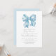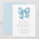 Un baby shower bleu classique et mignon avec un adorable arc bleu bébé en aquarelle pour un look intemporel et élégant. Un design simple et minimaliste avec du texte gris dans un mélange de police serif et de typographie de script de calligraphie, ajoutant une touche de sophistication. Fêtez la maman à être en style! Vous pouvez customiser les couleurs de police pour convenir à votre thème et ajuster la couleur arrière - plan sur l'avant et l'arrière. Idéal pour les baby showers toute l'année, mais surtout pour une fête de jardin ou un brunch. La décoration se fait sans effort avec des rubans et des arcs bleus, ou vous pouvez incorporer d'autres thèmes pour plus de flair ! Baby shower simple Aquarelle Bleu Bow Invitation avec Élégante Typographie Script. Disponible en tant qu'invitation imprimée ou en tant qu'invitation numérique téléchargeable pour faciliter l'envoi de courriels ou l'impression locale !