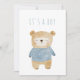 Célébrez l’arrivée de votre bébé garçon avec cette délicieuse invitation au baby shower avec un ours en peluche peint à la main dans les tons bleu et beige. Sur le devant, on peut lire "It's a Boy" au-dessus de l'ours dormant doux, offrant un look doux et moderne pour votre événement spécial. Un design minimaliste et une palette pastel douce se combinent pour une touche élégante et chaleureuse, parfaite pour les fêtes des nouveau-nés et les baby showers de charme.