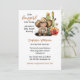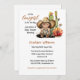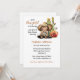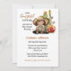 Un adorable dessin d'une petite cow-girl habillée de dungarees en denim ; portant des bottes de cowboy marron et un grand casquette en stetson surdimensionné avec des tournesols fixés dessus. Elle est assise sur ses hanches dans un tas de boue et a des joues roses et des cheveux blonds. Elle vous sourit doucement et est encadrée par un cactus vert aquarelle qui a une jolie fleur d'orange dessus. Il y a des modèles autour d'elle qui peuvent être personnalisés pour convenir à votre baby shower spécial ou fête d'anniversaire. L'arrière - plan pastel peach orange peut également être édité dans n'importe quelle couleur de votre choix.
