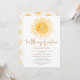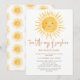 Prévoyez-vous un baby shower jumeau sur le thème du soleil ? Cette invitation au baby shower de soleil boho comporte le texte "Deux petits rayons de soleil sont presque ici!" avec une jolie aquarelle souriante soleil jaune. L'arrière est décoré d'un motif solarium. Parfait pour les jumeaux, les filles ou l'un de chaque baby shower. Facile à personnaliser. Aquarelle originale © Michele Davies.