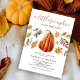 Cartes d'invitation pour baby shower rustique d'automne avec un fond blanc simple, de jolies feuilles d'automne aquarelles, une citrouille et un modèle de baby shower moderne facile à personnaliser.
