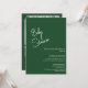Cette simple invitation au baby shower Emerald Green vous permettra d'accueillir des invités invitations à votre célébration. Il a un script blanc de base écrit à la main avec une police simple. Personnalisez en ajoutant des noms, des dates, des heures, des emplacements et d'autres informations.