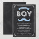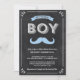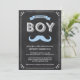 Cette vieille-timey invitation mignonne de baby shower inclut une moustache lunatique et le texte "elle a un garçon." La conception de tableau-style inclut également un cadre vintage d'amusement et un modèle de couleurs bleu-clair et blanc.