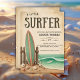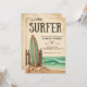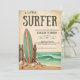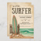 Cette invitation à baby shower d'inspiration vintage présente un thème de surf rustique avec un arrière - plan beige patiné, une planche de surf classique à rayures vertes appuyée sur une clôture en bois, et des coquillages épars sur le rivage sablonneux. La scène est complétée par des vagues turquoise de l'océan avec une petite planche de surf à cheval sur la houle, évoquant un charme nostalgique au bord de la plage. Si vous avez besoin d'un autre produit correspondant ou de la personnalisation, veuillez envoyer un message via Zazzle.