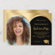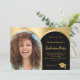 Ajoutez votre propre photo verticale du diplômé. Un cadre photo en faux arc doré. Un faux or et une couleur arrière - plan noire. Personnalisez et ajoutez un nom et des détails du parti.