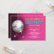 © Socialite Designs Inc. Célébrez la fête de la mariée à devenir en envoyant ces invitations amusantes à la fête de bal disco rose et argent. Customisez facilement le texte de votre événement en remplaçant le texte modèle. Design incorpore une boule de disco argent, arrière - plan rose avec des reflets et des starbursts qui peuvent être déplacés et redimensionnés. Le texte est fait pour ressembler à des néons.