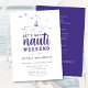 Un modèle d'invitation à la soirée nautique moderne, élégant et chic avec un imprimé d'encre d'une scène d'eau avec des vagues de l'océan, un bateau et des mouettes. Un design amusant, "Let's get nauti" pour une mariée moderne avec des modèles sur le dos pour toutes les informations sur le week-end amusant avec les filles. Un beau choix pour un week-end de bachelorette de plage, un week-end de bachelorette côtière, un week-end de bachelorette au bord de l'eau, un week-end de bachelorette en bateau ou en yacht.