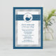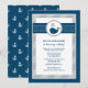 Cette invitation de baignée de bébé nautique mignonne présente une baleine marine amicale avec des éclaboussures d'eau en forme de cœur, sur un fond classique à pois et à rayures bleu marine et gris. Le motif de baleine charmant est parfait pour une célébration de bébé garçon. Un motif de baleine coordonné habille le dos de la carte. Tout le texte est entièrement personnalisable pour votre événement.