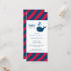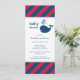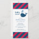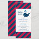 Cette invitation de bain de bébé au format mince présente une baleine marine amicale avec des éclaboussures d'eau en forme de cœur, sur un fond rayé diagonal rouge et bleu marine audacieux. La combinaison de couleurs nautiques classiques est parfaite pour une célébration de bébé garçon dans un format de carte élégant et moderne. Un motif de rayures coordonné habille le dos de la carte. Tout le texte est entièrement personnalisable pour votre événement.