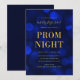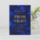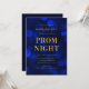 Invitation pour un bal de promo élégant avec les mots "Prom Night" en faux papier d'or sur un fond à motif de lumières bokeh bleu saphir. L'invitation a un dos avec un fond bleu.