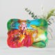 Personnage coloré, fantaisiste et vibrant de masquerade vénitienne. Une belle femme blonde sophistiquée est assise avec une rose rouge et un masque à plumes à la main, avec des tissus dorés et fuchsia scintillants d'un costume de bal masqué baroque avec des plumes et un chien. Peinture à l'aquarelle avec des couleurs vives en jaune, bleu, rose, vert, paillettes dorées et feuille d'argent, inspirée des personnages de la Comédie de l'Art (Commedia dell'Arte), du Carnaval de Venise et des masques à plumes vénitiens. Ce design cool et artistique est parfait pour les mariages, les cérémonies de noces, les enterrements de vie de jeune fille, les anniversaires de 16 ans, les fêtes de quinceañera, les soirées costumées d'Halloween, les bals costum