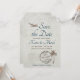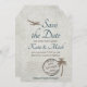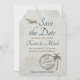 Ce look vintage Save the Date est en forme de bagage et décoré d'un vieux turbo propulseur, palmier et timbre postal, le rendant parfait pour une destination, un mariage tropical ou de plage. Tout ce qu'il faut, c'est un peu de ficelle ou de ruban, fileté à travers le trou au sommet avant de l'expédier, pour lui donner une touche plus authentique.