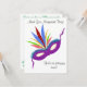 Mardi Gras Masquerade Ball Party Invitations pour votre fête spéciale. Avant de la carte a le plaisir de dire, Vous n'obtenez pas mes perles. Personnalisez l'arrière de la carte d'invitation avec les détails de votre événement de fête. Joli Masque violet festif avec plumes colorées vert, or, rec, bleu, rose et l'apparence des arrosages. Conçu pour les invitations de 4,25 po x 5,5 po. Oeuvre originale de TamiraZDesigns.