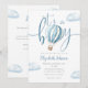 Cette charmante invitation à une baby shower présente un ballon à air chaud bleu et des nuages, ainsi qu'une typographie élégante. Avec votre code QR de liste de naissance et les détails de l'événement au verso. Conçu par Thisisnotme