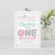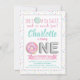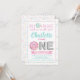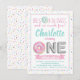 Cartes d'invitation pour fête d'anniversaire 1 an avec donut saupoudré fille avec donuts saupoudrés aquarelle et lettres de ballon en aluminium argenté sur fond de paillettes pastel. Cette invitation d'anniversaire premier donut est facilement personnalisable avec vos détails.