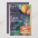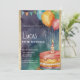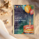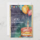 Cette invitation mignonne, moderne orange, violet, bleu et or ballon gâteau 5e anniversaire fête est parfaite pour votre petite étoile. Il présente un dessin d'aquarelle peint et dessiné à la main. Les éléments comprennent des ballons de gâteau orange vif, rose et turquoise, surmontés d'une aquarelle violette, vert menthe et arrière - plan à cadre doré. Tous les dessins sont imprimés.