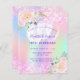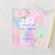 Une invitation à la fête d'anniversaire de 18e anniversaire, féminine et féminine (ou tout âge). Devant : Un arc-en-ciel, arrière - plan de couleur holographique en violet, rose, vert menthe, or rose. Décoré de parties scintillant rose vif, de mousseux et de ballons blancs. Personnalisez et ajoutez un nom et des détails du parti. Le nom est écrit avec un script de style écrit à la main, des lettres de couleur violette.