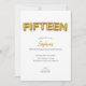 Célébrez quinze ans fabuleux avec ce ballon d'or moderne invitation photo 15e anniversaire! Le design est composé de lettres de bulles en faux or "FIFTEEN" en gras et d’un espace pour la photo préférée de votre ado. Tout le texte est entièrement modifiable, vous permettant de customiser le nom, les détails de l'événement et RSVP en quelques clics seulement. Parfait pour les 15 ans sucrés, les jardins ou les dîners d'anniversaire chic, cette invitation polie ajoute une touche personnelle à vos invités et fait un souvenir qui vaut la peine d'être sauvé.