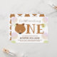 Notre petit ours est en train de lancer une première invitation d'anniversaire de naissance. Cette invitation est brune, blanche, rose et verte avec le mot "One" en grandes lettres avec une illustration du visage d'ours comme première lettre du mot et ballons rose et vert. Customisez simplement cette invitation, ajoutez-la à votre panier, et joyeux anniversaire à votre merveilleux bébé! Bear Balloons Baby First Birthday Invitation Jours fériés Conception | ©Melissa Patton - Artiste/Illustrateur